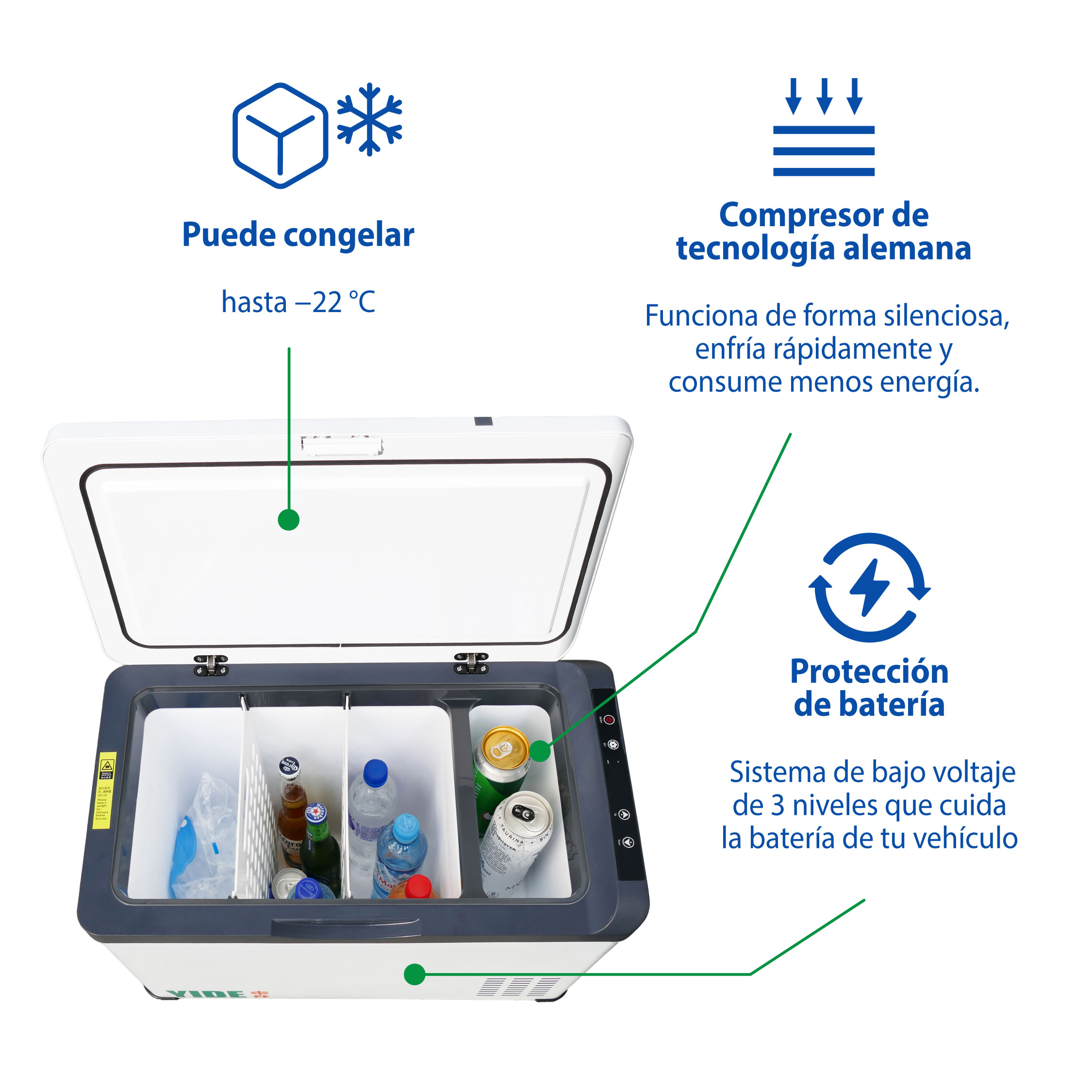 El YD-30L es un cooler portátil de alto rendimiento diseñado para quienes requieren mayor capacidad de almacenamiento sin perder eficiencia ni control térmico. Su sistema de refrigeración por compresor permite enfriar y congelar hasta −22 °C, ofreciendo un desempeño estable y confiable para viajes largos, trabajo en ruta o uso diario. Cuenta con pantalla digital LED para un control preciso de la temperatura y es compatible con 12/24 V DC y 110/220 V AC, lo que permite su uso tanto en vehículos como en el hogar.